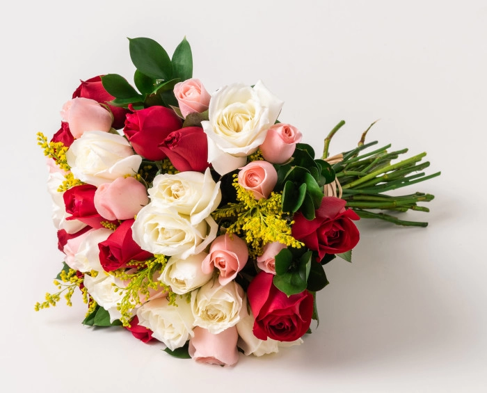 Três cores de rosas nacionais compõem o buquê perfeito para você presentear alguém especial, tornando qualquer momento inesquecível. Com ruscus, tango e acabamento em ráfia, ele fica mais belo e completo.