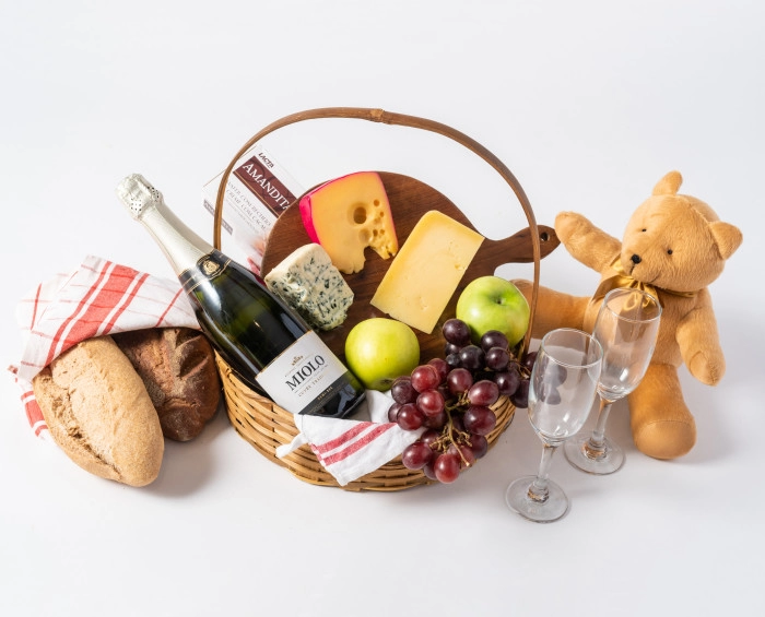 Esta cesta acompanha 2 tipos de frutas, deliciosos bombons, uma linda pelúcia no tamanho de 30cm. Para dar mais sabor, 2 tipos de pães, 3 tipos de queijo e 2 taças de vinho. Acompanha espumante de 750ml e uma tábua de cortar queijos.